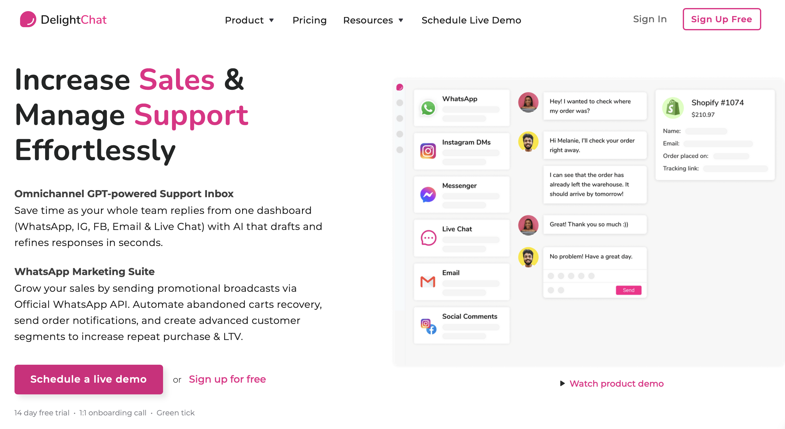 Best For: Ecommerce and D2C brands of all sizes that want to manage customer support across WhatsApp, Instagram, Facebook, Email, and Live Chat while also running WhatsApp marketing campaigns from a single platform.